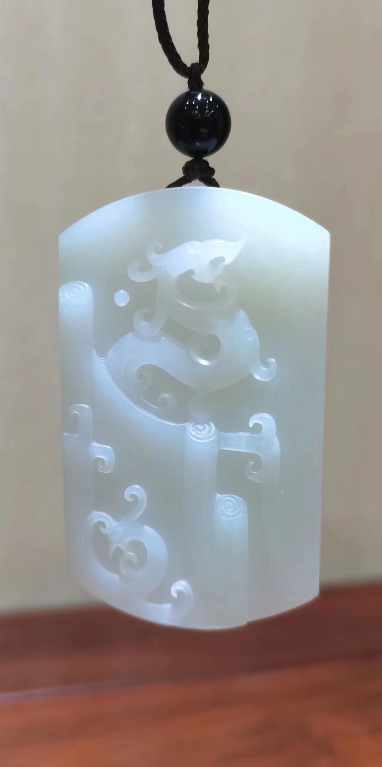 此款和田玉龍牌,雕工嫻熟,自然流暢,線條優美,雕刻祥龍在道山學海搏擊翻騰、穿躍海天、學業有成,終能遨游天際、叱詫風云。故得名:大業有成