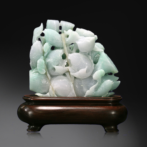 編號:F1011-24 作品構思巧妙,運用圓雕、浮雕、俏色雕,采用寫實手法,鯉魚躍然而起于荷葉之間,極具動感,工藝細膩,構圖完整,分色清楚,形象生動,美觀逼真,喜慶之意呼之欲出。 “魚”與“余”諧音,象征吉慶有余、連年有余。