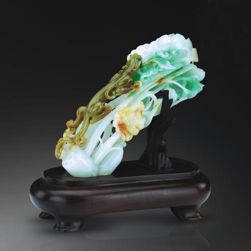 三彩翡翠玉料,質地細潤,色彩強烈,以分色技法精雕。