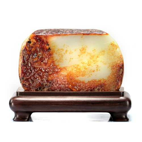 玉質(zhì)細(xì)膩縝密,油潤細(xì)濡,整器厚重,敦厚優(yōu)美,全身覆艷麗皮色乃棗紅與濃淡不一的黃色相間,醒目喜慶,色澤誘人。其尺寸大小適正,展、供、仰、賞俱佳。